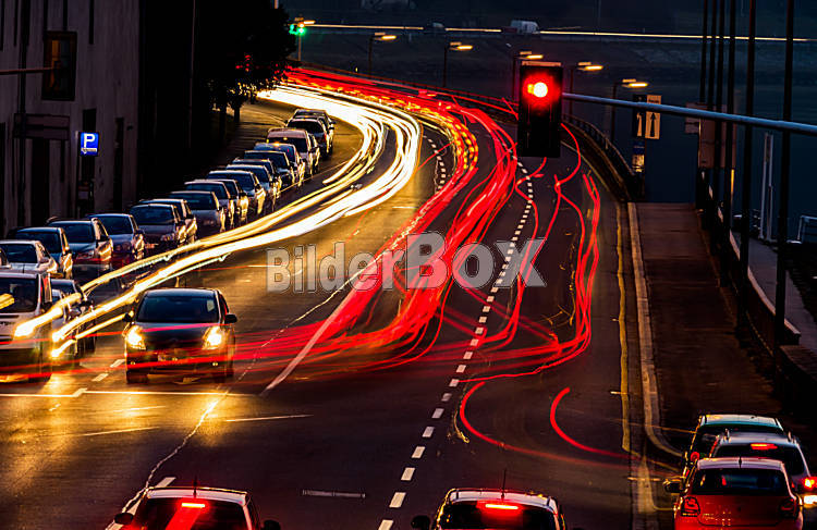 Beschreibung Autoverkehr in der Stadt bei Nacht, Symbol für Verkehr, Stau, Luftverschmutzung