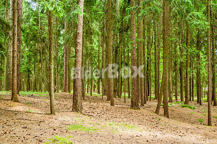 Beschreibung Viele Bäume in einem Wald mit frischem Grün