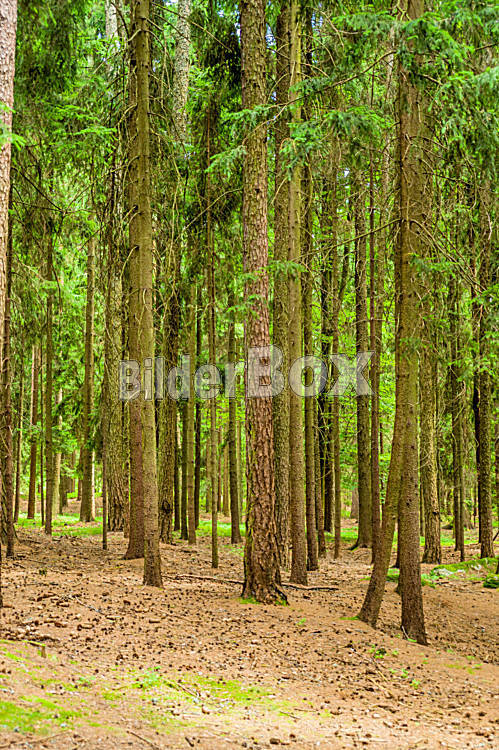 Beschreibung Viele Bäume in einem Wald mit frischem Grün
