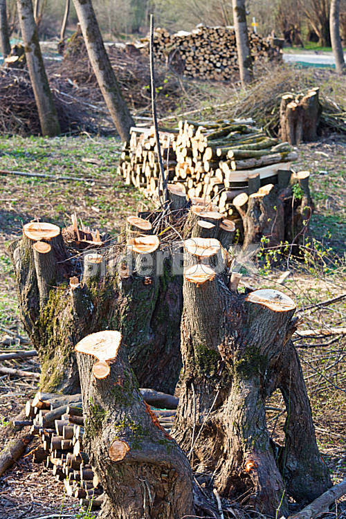Beschreibung Viele Bäume in einem Wald wurden umgeschnitten. Pflege des Waldes