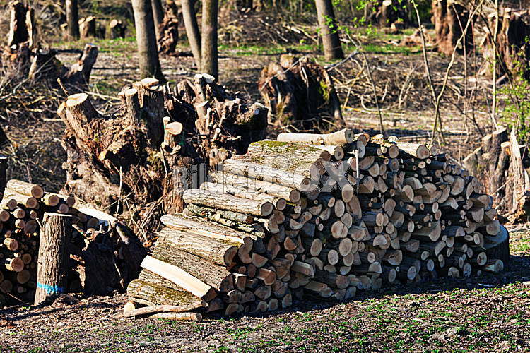 Beschreibung Viele Bäume in einem Wald wurden umgeschnitten. Pflege des Waldes