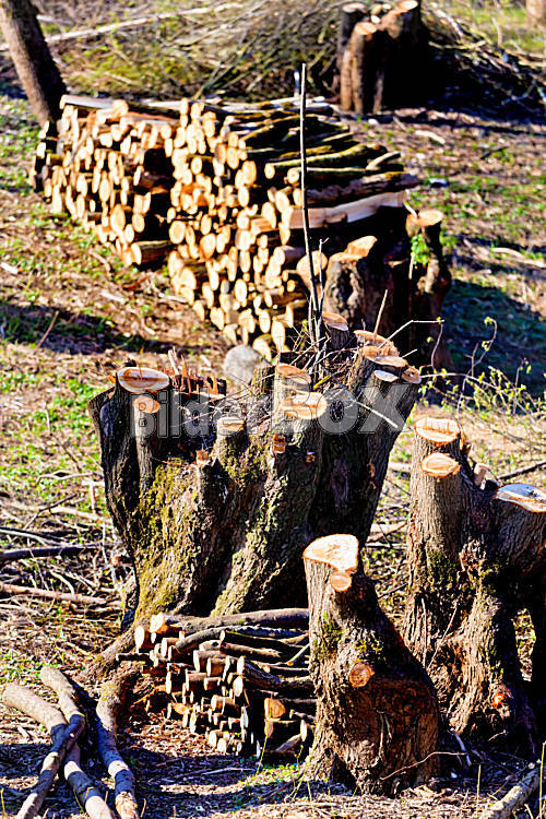 Beschreibung Viele Bäume in einem Wald wurden umgeschnitten. Pflege des Waldes