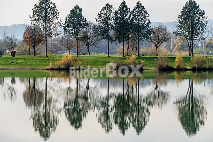 Beschreibung Bäume spiegeln sich im See, Symbol für Melancholie, Meditation, Ruhe