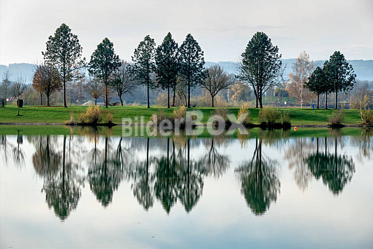 Beschreibung Bäume spiegeln sich im See, Symbol für Natur, Idylle, Kontemplation