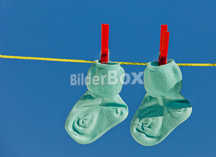 Beschreibung Baby Socken auf Wäscheleine zum Trocknen. Blauer Himmel.