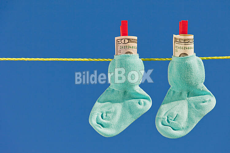 Baby Socken auf Wäscheleine mit Dollar Geldscheine