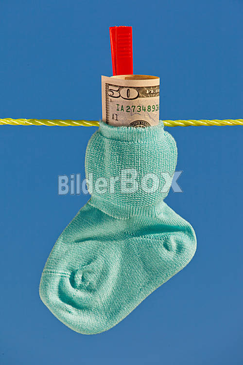 Baby Socken auf Wäscheleine mit Dollar Geldscheinen