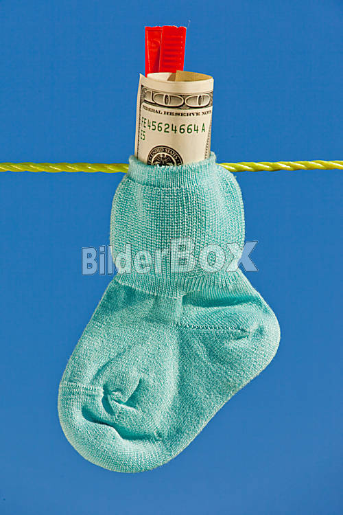 Baby Socken auf Wäscheleine mit Dollar Geldscheinen