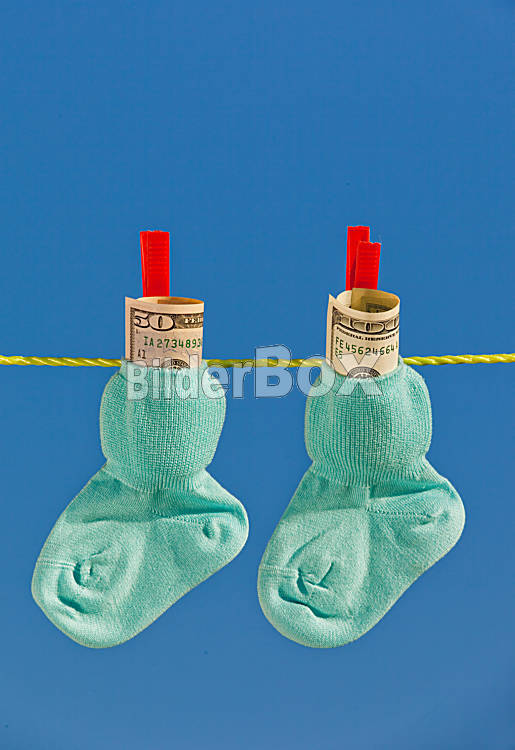 Baby Socken auf Wäscheleine mit Dollar Geldscheinen