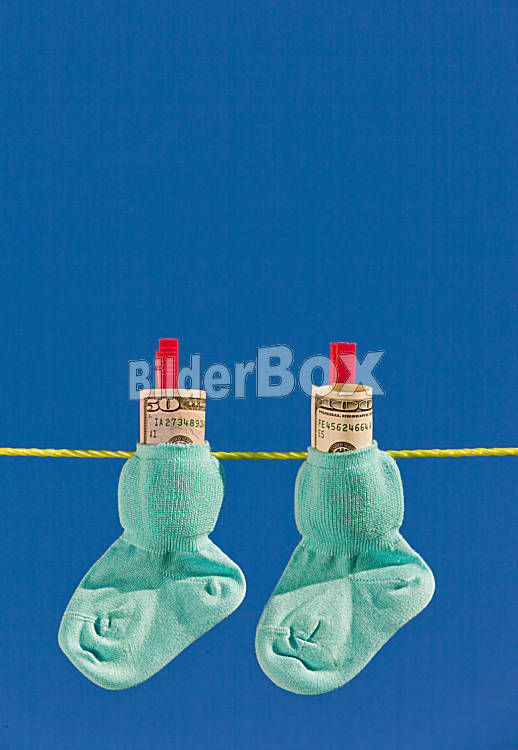 Baby Socken auf Wäscheleine mit Dollar Geldscheinen