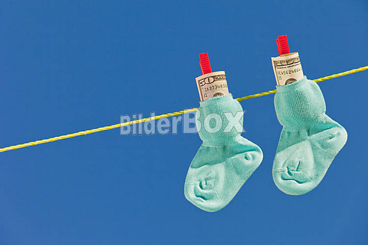 Baby Socken auf Wäscheleine mit Dollar Geldscheinen