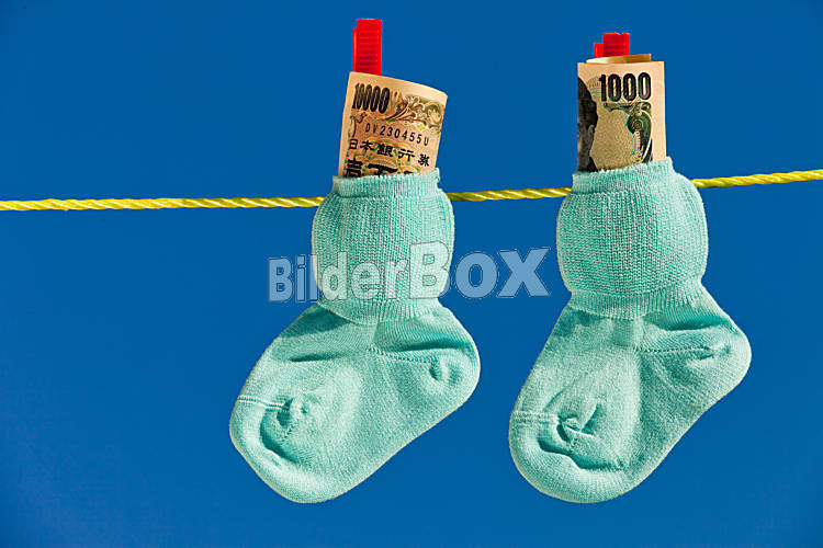 Beschreibung Baby Socken auf Wäscheleine mit Yen Geldscheinen aus Japan.