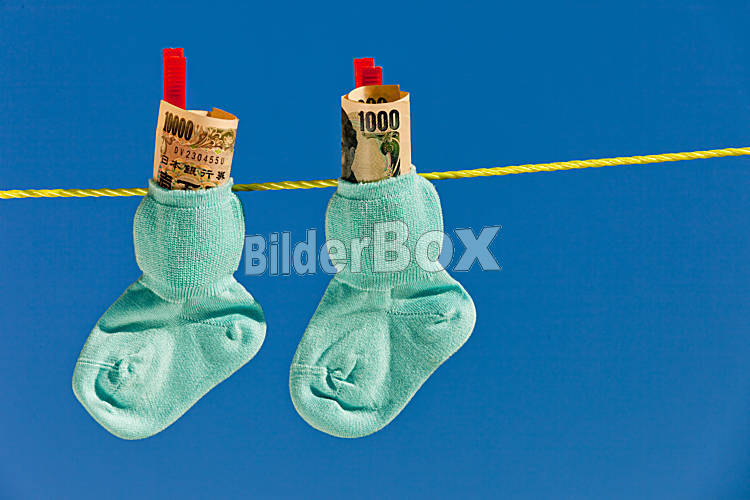 Beschreibung Baby Socken auf Wäscheleine mit Yen Geldscheinen aus Japan.