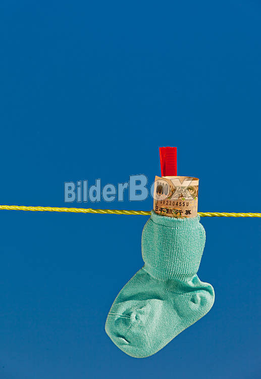 Beschreibung Baby Socken auf Wäscheleine mit Yen Geldscheinen aus Japan.