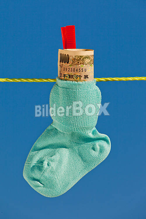 Beschreibung Baby Socken auf Wäscheleine mit Yen Geldscheinen aus Japan.