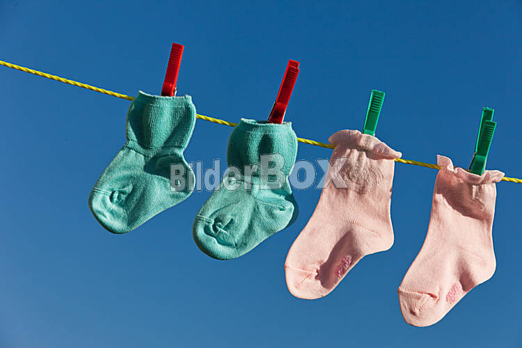 Beschreibung Baby Socken auf Wäscheleine zum Trocknen. Blauer Himmel.