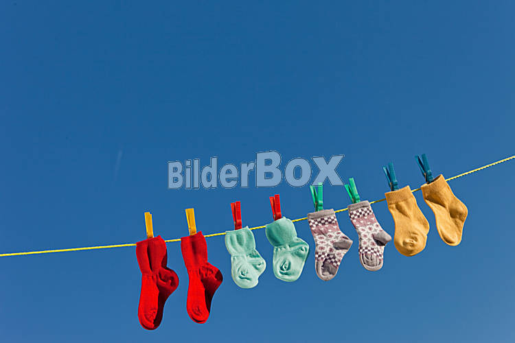 Beschreibung Baby Socken auf Wäscheleine zum Trocknen. Blauer Himmel.