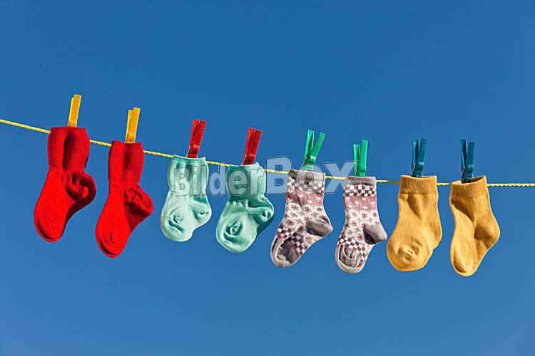 Beschreibung Baby Socken auf Wäscheleine zum Trocknen. Blauer Himmel.