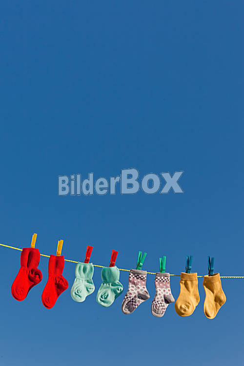 Beschreibung Baby Socken auf Wäscheleine zum Trocknen. Blauer Himmel.