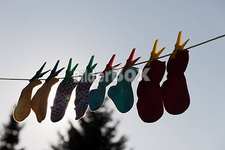 Baby Socken auf Wäscheleine zum Trocknen