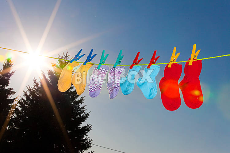 Beschreibung Baby Socken auf Wäscheleine zum Trocknen. Blauer Himmel.