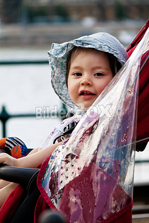 Beschreibung Ein kleines Kind sitzt in einem Kinderwagen und schaut umher