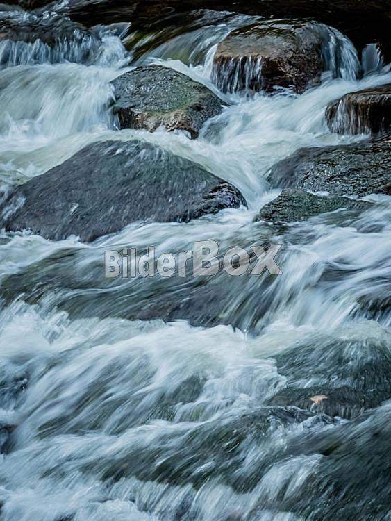 Beschreibung Ein Bach mit Steinen und fliessendem Wasser. Landschaft erleben in der Natur.