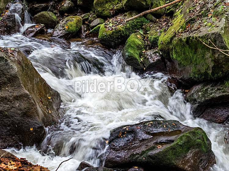 Beschreibung Ein Bach mit Steinen und fliessendem Wasser. Landschaft erleben in der Natur.