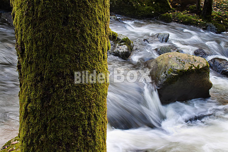Beschreibung Ein Bach mit fließendem Wasser und Steinen (Felsen)