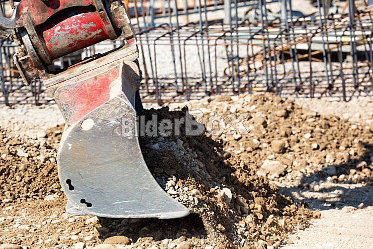 Beschreibung Ein Bagger mit Schaufel auf einer Baustelle