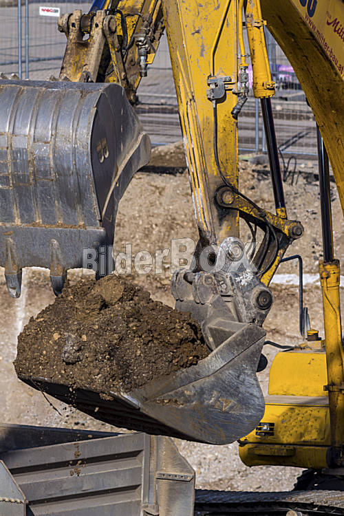 Beschreibung Bagger auf einer Baustelle. Baggerschaufel mit Erde, Erdarbeiten.
