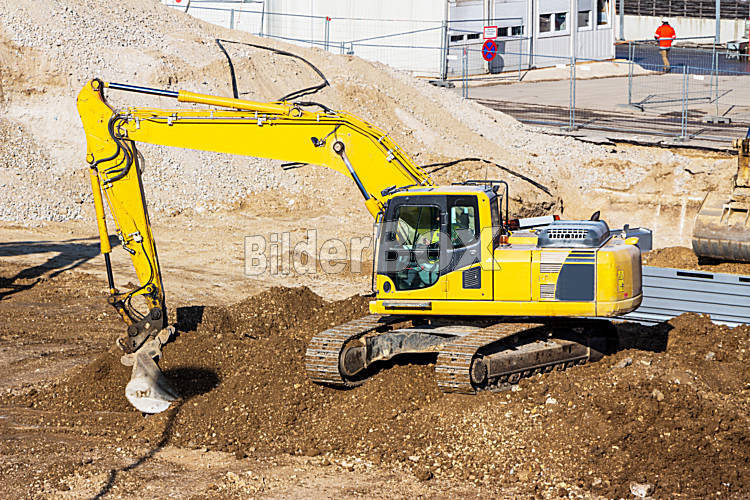 Beschreibung Bagger auf einer Baustelle. Baggerschaufel mit Erde, Erdarbeiten.