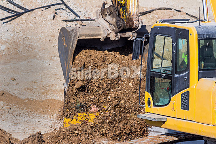 Beschreibung Bagger auf einer Baustelle. Baggerschaufel mit Erde, Erdarbeiten.