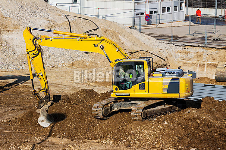 Beschreibung Bagger auf einer Baustelle. Baggerschaufel mit Erde, Erdarbeiten.
