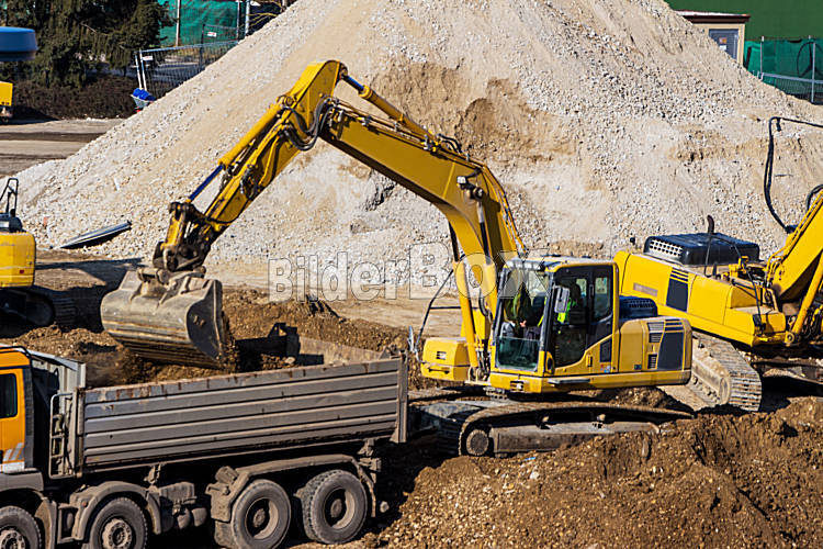 Beschreibung Bagger auf einer Baustelle. Baggerschaufel mit Erde, Erdarbeiten.
