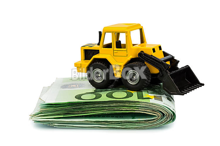 Beschreibung Ein Bagger steht auf Eurogeldscheinen. Symbolfoto für Kosten, Erträge und Förderungen im Baugewerbe und der Bauwirtschaft