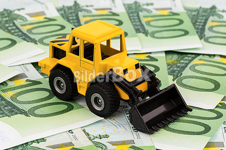 Beschreibung Ein Bagger steht auf Eurogeldscheinen. Symbolfoto für Kosten, Erträge und Förderungen im Baugewerbe und der Bauwirtschaft