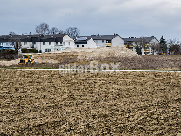 Beschreibung Bagger stehtb auf Baustelle. Ein neues Mehrparteienhaus wird gebaut.