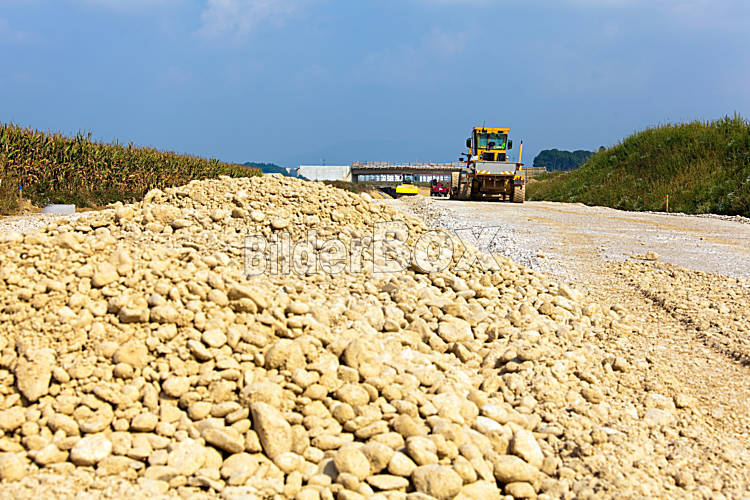 Beschreibung Baustelle mit einem Bagger beim Bau einer neuen Strasse
