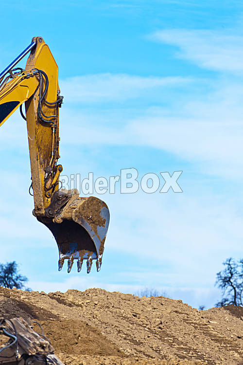 Beschreibung Ein Bagger auf einer Baustelle bei Bauarbeiten. Erdarbeiten und Baggerarbeiten.