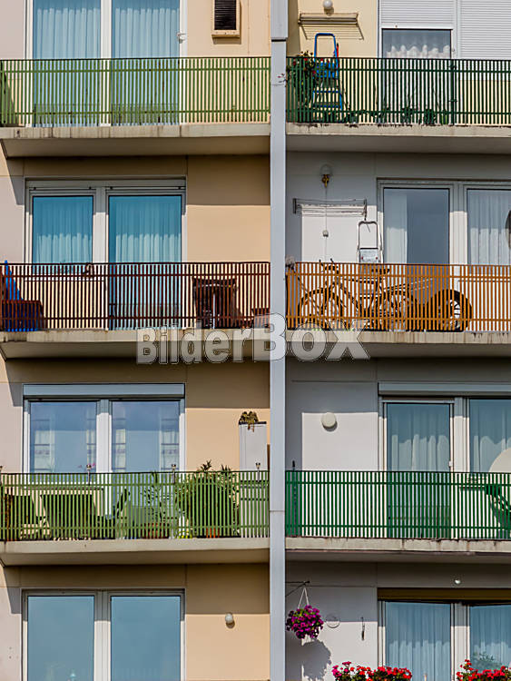 Beschreibung Viele Balkone in einem Wohnhaus für mehrere Parteien in einer Stadt.