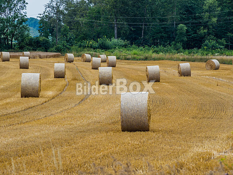 Beschreibung Strohballen liegen nach der Ernte auf einem Feld in der Landwirtschaft