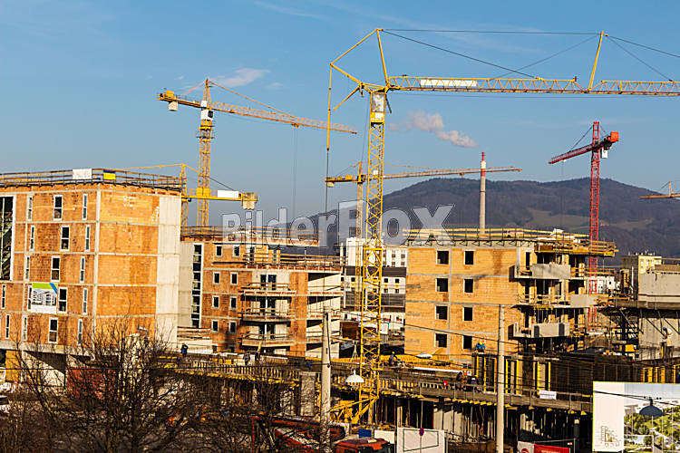Beschreibung Baustelle für ein Wohnhaus für mehrere Mieter. Urbaner Wohnbau in der Stadt.