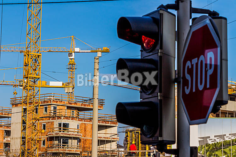 Beschreibung Baustelle für ein Wohnhaus für mehrere Mieter. Urbaner Wohnbau in der Stadt.