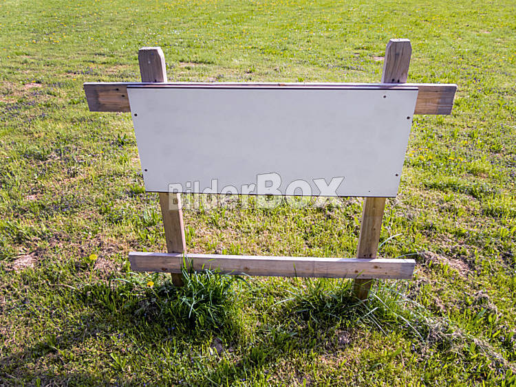 Beschreibung Auf einer Wiese steht ein Schild "Baugrund für Haus zu verkaufen". Bauplatz für ein neues Eigenheim.