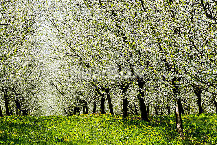 Beschreibung Ein blühender Obstbaum im Frühling. Vor blauem Himmel