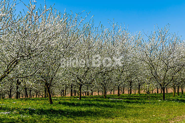 Beschreibung Ein blühender Obstbaum im Frühling. Vor blauem Himmel