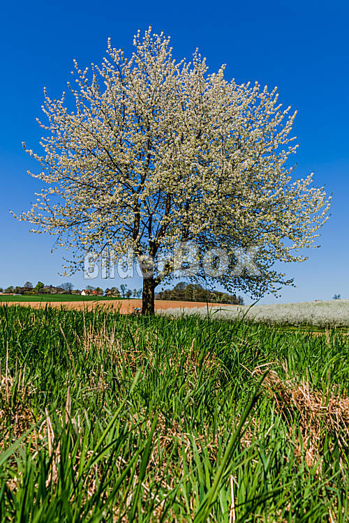 Beschreibung Ein blühender Obstbaum im Frühling. Vor blauem Himmel