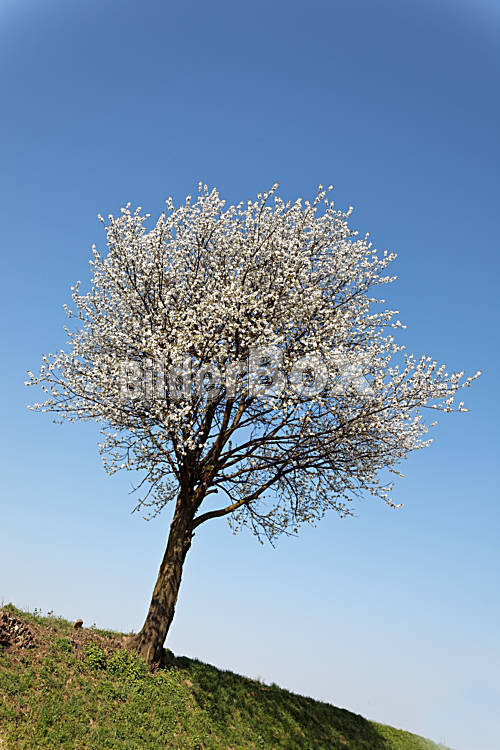 Beschreibung Baum im Frühling mit Blüten vor blauem Himmel