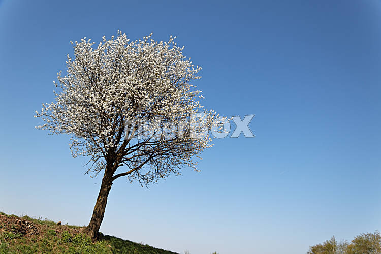 Beschreibung Baum im Frühling mit Blüten vor blauem Himmel